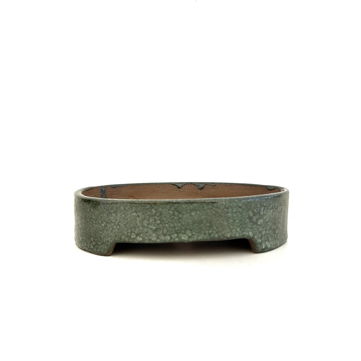 Maceta del ceramista español kokekusa, esmaltada en color verde moteado sobre mezcla de barros color marrón, pieza ovalada ideal para un árbol de tamaño medio.